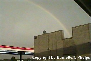 It was at this time that we heard of two other storms. One was down by Hutchinson and the other was in Pratt County. We heard reports that the one in Pratt county was showing signs of rotation, and after hearing that the storm near Hutchinson was not causing much trouble, we decided to head south to U.S. 54 and then west toward the storm that was moving out of Pratt County and into Kingman County. By the time we got close to the storm on the north side of Garden Plain in far western Sedgwick County, we spotted a rather decent downburst (image below). This time instead of being in it, we were at a far enough distance to observe and video tape it. It had weakened a little bit by the time we were able to move into position to video tape it. We also got some shots of cloud-to-ground lightning with this particular storm (images above). The storm also began to move toward us rather quickly. Attempting to stay ahead of it, we drove back to the east toward Goddard. The storm eventually caught up with us west of Goddard and we had to pull over to wait for it to pass by. This time we just endured heavy rainfall and not much wind. Eventually the sun emerged from behind the rain and formed a spectacular double rainbow to our east (images below).
