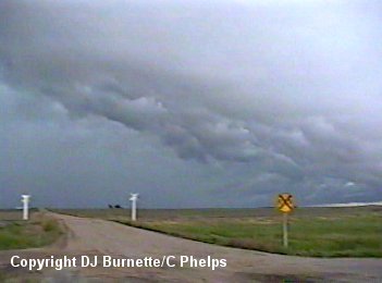 We pulled over near the junction of U.S. 283 and U.S. 64 west of Rosslon, OK to watch the storm approach us and watch the wall cloud. As before it did rotate for a brief time before it dissipated. However, as we continued to watch the storm, it was quite apparent that it was becomming more absorbed into the squall line with horizontal roll clouds now noted on its leading edge. With that being the case and the fact that darkness was upon us, it was time to decide how we would get home through the storms to our north and without those to our west catching us.