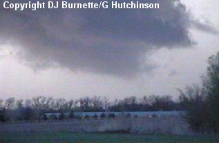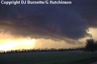 Eventually, the wind shifted direction and outflow from the storm was noted at our location. It became quite clear that the storm was not going to produce any further tornadoes. We did note another developing thunderstorm off to the southwest, and I maded a telephone call to WeatherData in order to find out what was going on with it. Mike Smith mentioned the storm looked very healthy on radar, and may do something as it moved northeast toward the outflow we were experiencing. This seemed very reasonable to me, so I directed the chase team back to the southwest on K-61 toward the new thunderstorm.