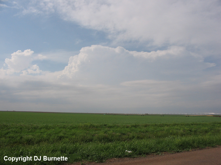 I departed Fayetteville, AR shortly after 9 a.m. CDT, but stopped in Lawton, OK, to check the latest data and have a late lunch. The dryline was still well out to the west near the NM/TX line, but it continued to appear that the thunderstorms would develop ahead of the dryline in the deeper moisture supply. Good instability had already developed from the southeastern TX Panhandle southward into western TX. Thus, preliminary target of Hollis, OK, was maintained, and I arrived in Hollis shortly after 3:30 p.m. CDT. Thunderstorms were developing off to the west. The lead thunderstorm was located just across the TX/OK line (image below; view is west of Hollis looking west). I decided to follow this lead thunderstorm, and moved north on OK-30 out of Hollis. This storm looked less impressive with time though. Meanwhile, there were other thunderstorms farther to the west into the TX Panhandle, so I decided to move west on OK-9 and TX-203 to Wellington, TX, and then south on U.S. 83.