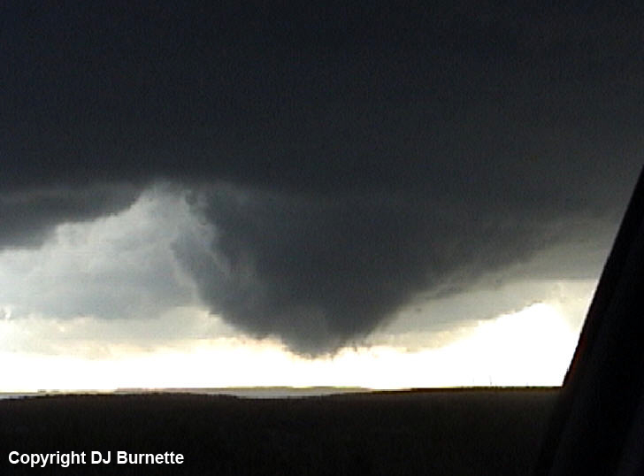 Cloud-to-ground lightning was quite frequent (see video captures of lightning in wall cloud images above and in tornado images below), and that kept me confined to filming the wall cloud from inside the car as the first tornado with this storm developed (images below; view is north-northwest of Turkey looking southwest toward Caprock State Park). Radar imagery is also included below (blue/white dot denotes my location). The radar data are at approximately the same time as tornadogenesis.