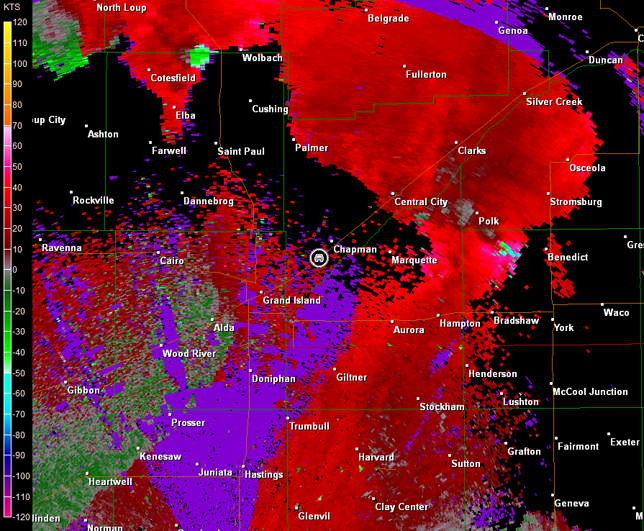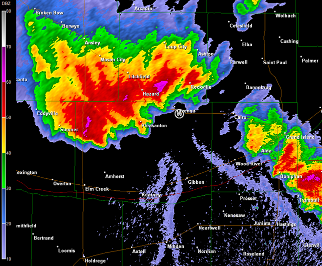 I followed the storm into Ravenna, where the tornado sirens were sounding. Various circulations were all around me, and I was not comfortable with my location. Instead, I chose a country road a little farther east to follow the storm up toward Rockville, NE. There was a tendency for new storms to the southeast to become the tornado producers, and a big storm to the southeast of me was catching my attention. I decided to go after this cell post-haste. It was the correct move, but I was on the wrong side. As I moved around the northern portions of Grand Island, NE and began to move up U.S. 30, a report of a multi-vortex tornado came through. I stayed on target and hoped that I could come around on the backside of the storm just as it crossed U.S. 30. Radar images are below with the car symbol depicting me chasing this tornadic supercell north-northeastward.