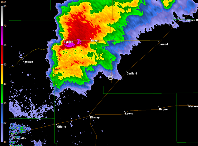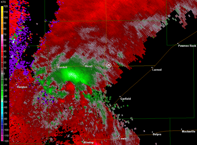 We moved farther to the north through Sanford, and then sat northeast of Sanford just off K-156 highway to watch the wall cloud continue to organize. Rotation dramatically increased on radar and the storm showed a classic hook echo (imagery below; car symbol denotes our location). A large tornado then developed about five miles to our southwest. It moved north-northeast and crossed K-156 just west of Rozel, KS (images below; view is northeast of Sanford, looking southwest). Unfortunately, this tornado did do damage to five farms and one farm house. Debris can be observed in the images below as well as in the video. Radar data also include the new dual-polarization correlation coefficient product. Note the lower correlations denoted by the bluer colors southwest of Rozel and near Rozel in the first and second correlation coefficient images below, respectively. These lower correlations were in the same place as the circulation on storm relative velocity data suggesting a tornado is on the ground and debris is being lofted (debris is of varying size, so correlation values decline).