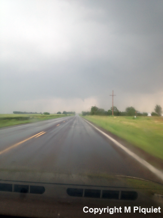 The cell near us eventually became the dominant supercell. Unfortunately, that meant we were out of position, as we moved north across the KS/OK line into Caldwell, KS. We attacked the storm from the west and punched through the rain east of Caldwell. A tornado developed in front us, and Megan snapped pictures while we continued to move eastward through the rain (images below; view is east of Caldwell, looking east). It is possible that we may have seen two separate tornadoes, since a couple of different reports are noted in the database, and the tornado in images 5 and 6 (lower right below) is back south of the highway again. That said, U.S. 81 turns north a bit between Caldwell and South Haven, KS, and rain was obscuring our view at times, so it is difficult to say for certain. Radar data are below, but our location, denoted by car symbol, is only approximate, since we were in motion and I was unable to reconstruct our precise location (GPS had failed on me all three chase days). Radar data also have issues with range-folding.