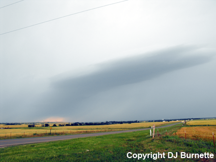 By 4:45 p.m. CDT, storms were exploding to the west of El Reno, and I moved west on I-40 to U.S. 270 and sat on U.S. 270 south of Calumet, OK to view the storms (images below; view is south of Calumet, looking west). Radar showed three individual storm cells with organization occurring on the backside of the main cell in vicinity of Bridgeport, OK (images below; car symbol denotes my location).