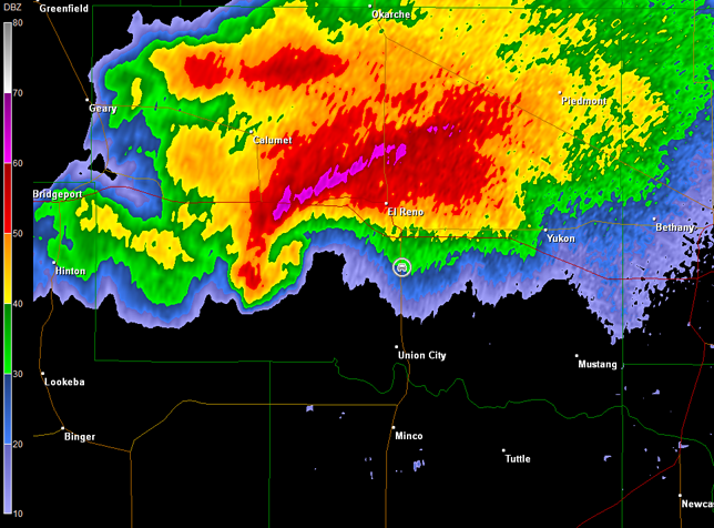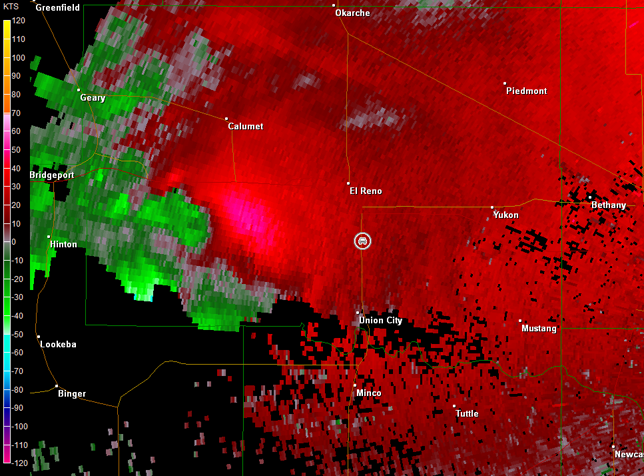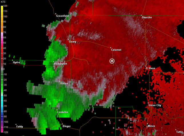 A Google Earth image is below denoting the El Reno tornado's track. These data were derived from the official National Weather Service damage survey and radar data from the University of Oklahoma RaXPol and the Norman, OK radar. Also included in this image is my track derived from the GPS. Radar data from the time when the tornado was crossing U.S. 81 are below the Google Earth map. My location is denoted with the car symbol. It is very likely that I encountered the outer circulation of this massive tornado per the Google Earth map and the radar data. This is a very bad location! I hope others can learn from this.