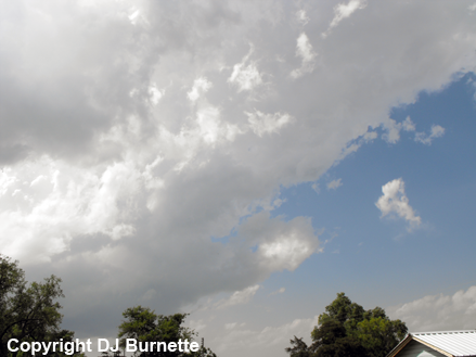 I arrived in El Reno in the early afternoon, had lunch, and then located a city park, where I could continue to keep a close eye on conditions under the comfortable shade of a tree. At 3:30 p.m. CDT, PDS tornado watch number 262 was issued for the area (PDS=Particularly Dangerous Situation). About 30 minutes later, towering cumulus clouds were observed near my location (images below; view is looking west from the westside of El Reno).