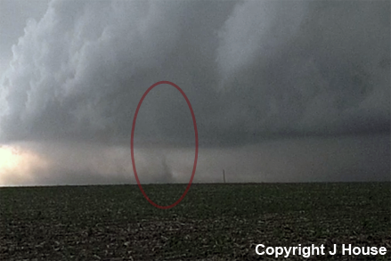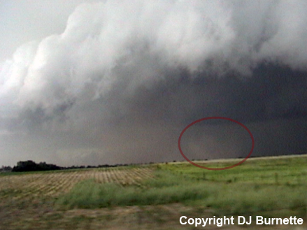 It should come as no surprise that most of what we saw during this chase was blowing dust due to the high straight-line winds within the rear-flank downdraft and gustnadoes on the leading edge of the rear-flank downdraft. However, gustnadoes are shallow vortices which do not extend up to the cloud base, and there were times on this chase, where we observed rotating dust up to the cloud base with rotation noted in the cloud base. Such vortices blur the line between large gustnado and landspout tornado. For sure, this is a gray area, and it illustrates the problem associated with strict classifications. The atmosphere produces a wide range of vortices, and doesn't care how we classify things (see also the "What is a tornado?" essay by Dr. Chuck Doswell). Perhaps rear-flank gust front interaction with the surface warm front was part of the reason we observed large gustnadoes/landspout tornadoes rather than just simple shallow gustnadoes. See further discussion at the end of this storm chase account.