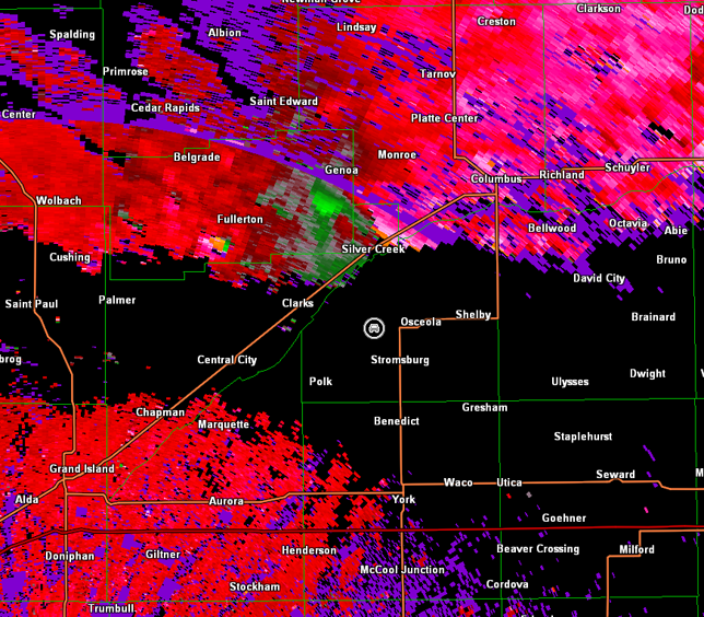 Tornadoes continued to be reported to our north as we passed by North Loup and Scotia, NE on our way back to U.S. 281. Unfortunately, NE-11 had taken us a bit far southeastward, and we could not see the tornadoes to our north. The storm moved east-southeast at a rapid 45-50 mph throughout this chase, which meant it was constantly on our tail. The storm was also a high-precipitation supercell by this time, and this combined with its speed and rivers limiting escape options meant that we had to play very conservatively. There was no real chance for us to get up into the notch and look at the mesocyclone area of the storm at any time following our close encounter with it in vicinity of Ord. The radar imagery below will show that we consistently played the southern end of the storm in advance of the rear-flank gust front. This supercell storm was also being warned for straight-line winds to 70 mph, and those winds were likely realized within this region of the storm given our observations.
