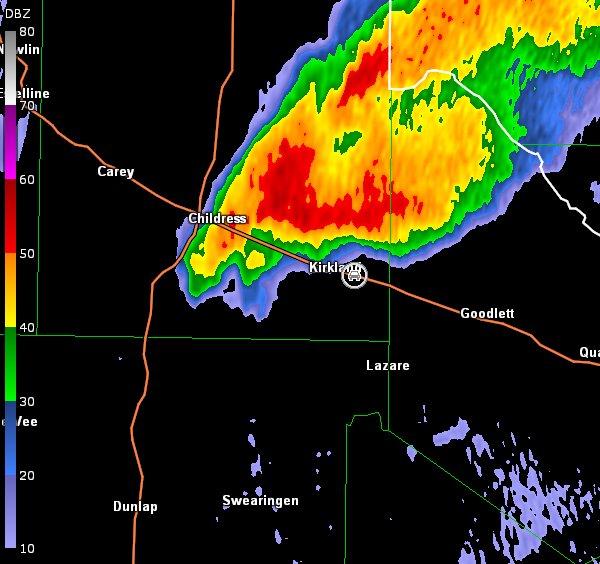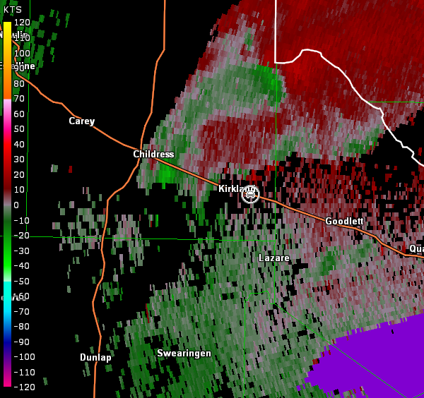 We continued farther on U.S. 83 into Childress and sat there for a little bit watching storms mature to our southwest. Unfortunately, we were out of position (northwest of the storms) and spent a lot of time swinging around the forward-flank on a road network that would not cooperate, before we could attack a tornadic storm from a better angle. This cost us to miss a confirmed tornado. By the time we caught up with the storm in vicinity of Kirkland, the first circulation was well off to our north, but the cell farther southwest continued to look interesting (radar images below; car symbol denotes our location). Complex cell interaction occurred, while we were watching, and we never saw anything more than a rain-free base (images below; view east-southeast of Kirkland, looking west).
