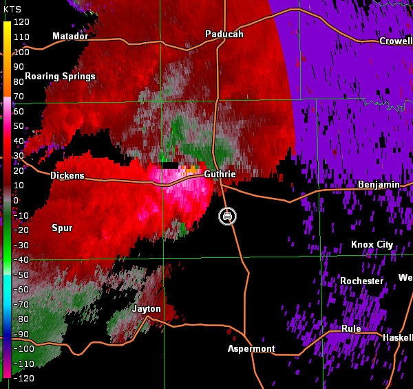 This messy situation forced us to retreat into Childress to reassess the situation. Additional scattered thunderstorms were noted farther to the south-southwest, so we decided to head south on U.S. 83 toward these storms. By the time we were halfway between Paducah, TX and Guthrie, TX, we heard a tornado warning had been issued on the storm to our southwest. We continued south into Guthrie and then moved west on U.S. 82 toward the storm. Unfortunately, we would never get a great intercept on the storm because it took a hard, right turn. We moved back east on U.S. 82, then south on U.S. 83, and finally stopped south of Guthrie to view the storm. We heard a report of a large and extremely dangerous tornado in progress, but radar data showed the circulation was all rain-wrapped once again (images below; car symbol denotes our location; note the switch to the Lubbock, TX radar). Therefore, we observed nothing other than low hanging scud well removed from the main circulation (images below; view south of Guthrie, looking west).